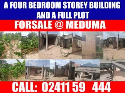 Four bedroom storey building is for sale at meduma in kumasi. Very Good location, electricity and water available, everything is intact, call now for negotiations. 0241159444.
